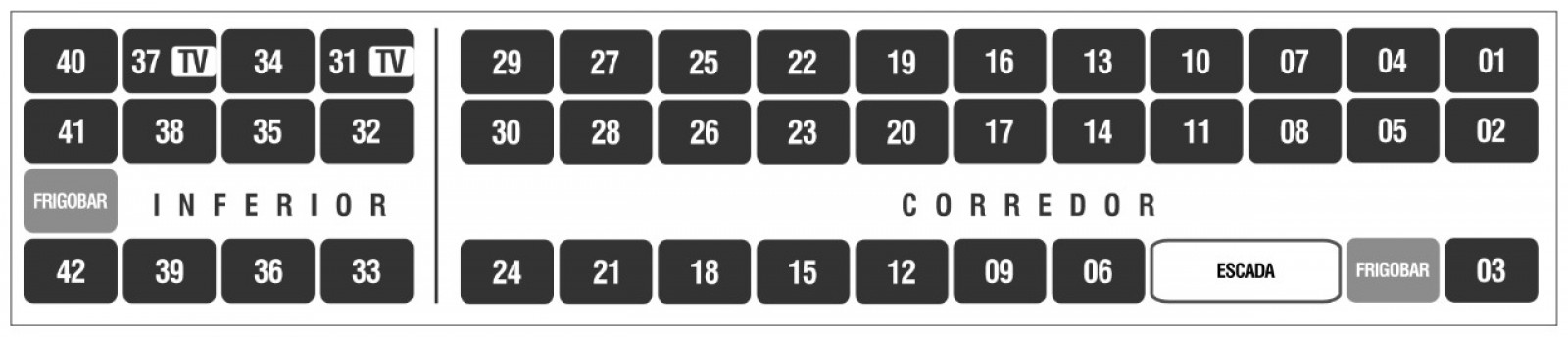 MAPA DE ASSENTOS DO ÔNIBUS LEITO CAMA DD - 2 ANDARES 26 LUGARES »