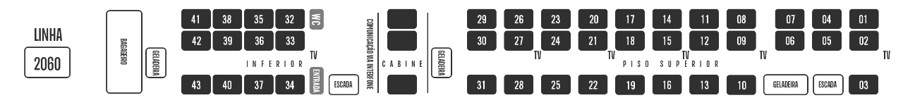MAPA DO ÔNIBUS TOTAL LEITO DD - 2 ANDARES 43 LUGARES»