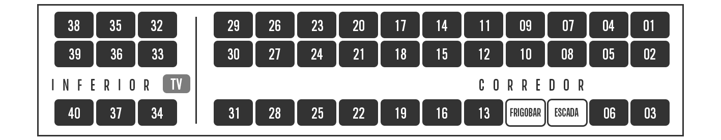 MAPA DE ASSENTOS DO ÔNIBUS LEITO TOTAL DD - 2 ANDARES 40 LUGARES- EMPRESA SPAZZINITUR »