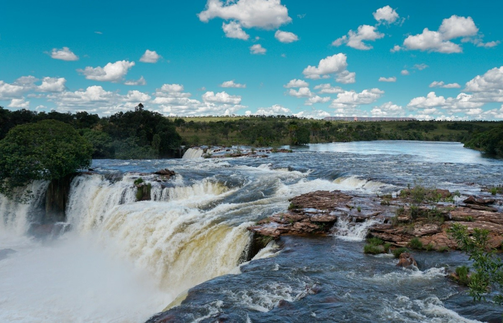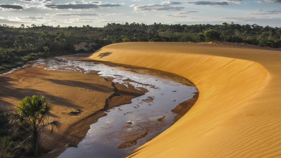 SOBRE O DESTINO » O Parque Estadual do Jalapão se encontra ao leste do Estado do Tocantins, abrangendo os municípios de Ponte Alta do Tocantins, Mateiros, São Felix do Jalapão, Novo Acordo, Santa Tereza e Lagoa do Tocantins. Passou a ser parque estadual em 2001 e possui uma área total de 34 mil km². Um verdadeiro oásis no coração do Brasil. Com uma das menores densidades demográficas do país, de 0,8 hab/km², é possível passar dias no Jalapão sem ver uma única pessoa. É um passeio indicado para quem gosta de natureza intocada, de belas paisagens e de grandes aventuras. Brasil, um lugar abençoado por natureza. Bem no centro deste país, no estado do Tocantins, encontra-se um paraíso natural de beleza única: o Jalapão, um dos principais roteiros para quem pratica o ecoturismo e o turismo de aventura. No mundo, com certeza, não há cenário igual. A região do Jalapão é um lugar de descobertas permanentes. Em plena mata de transição entre o cerrado e a caatinga, onde predomina uma vegetação rasteira similar às savanas, surgem cachoeiras, rios de águas cristalinas, corredeiras, grandes chapadas e formações rochosas de cores e formas variadas. Destacam-se dunas de areias douradas, com até 40 m de altura, o que levou o lugar a ser chamado de deserto do Jalapão. Seria um deserto, se o Jalapão não fosse também um paraíso das águas e um lugar onde a presença de flores e animais exóticos salta aos olhos. Um convite à contemplação e à aventura.